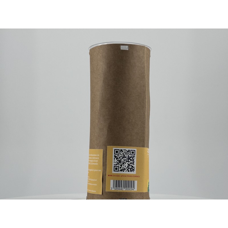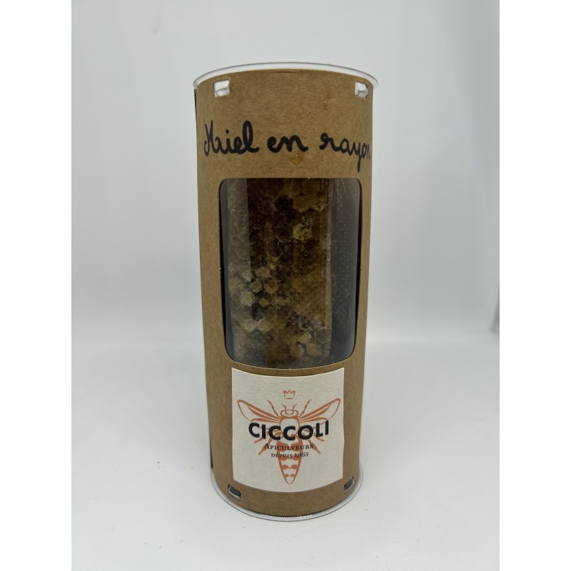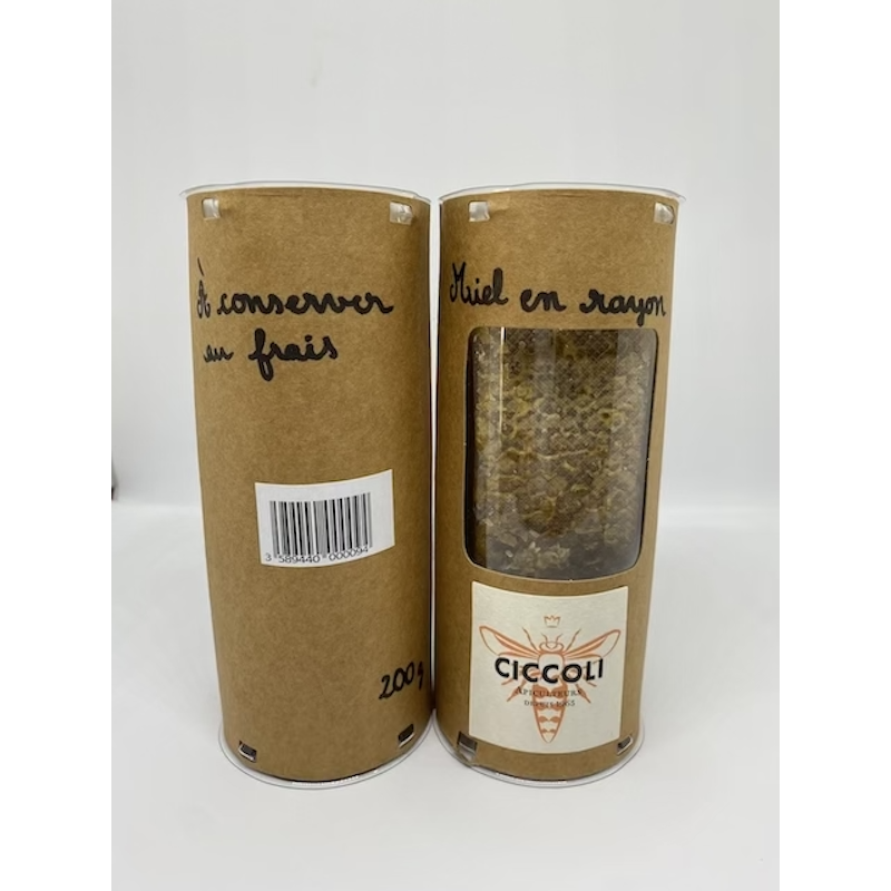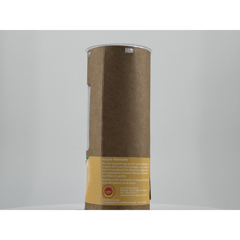 Miel de maquis de printemps très doux. Environ 150 gr en rayon. Le pot est complété par le même miel AOP.