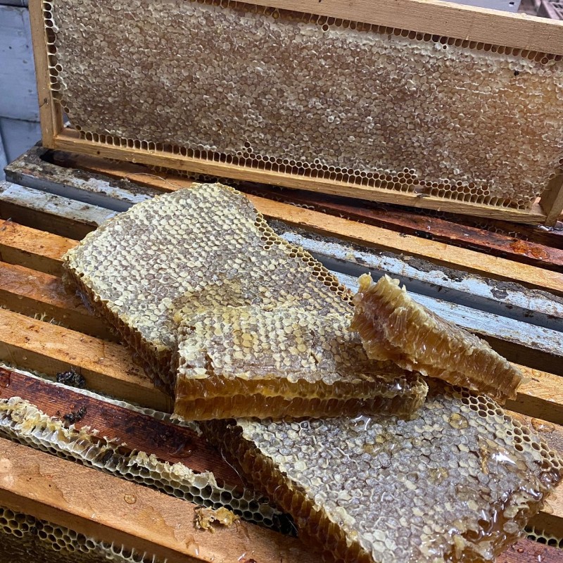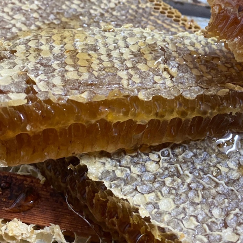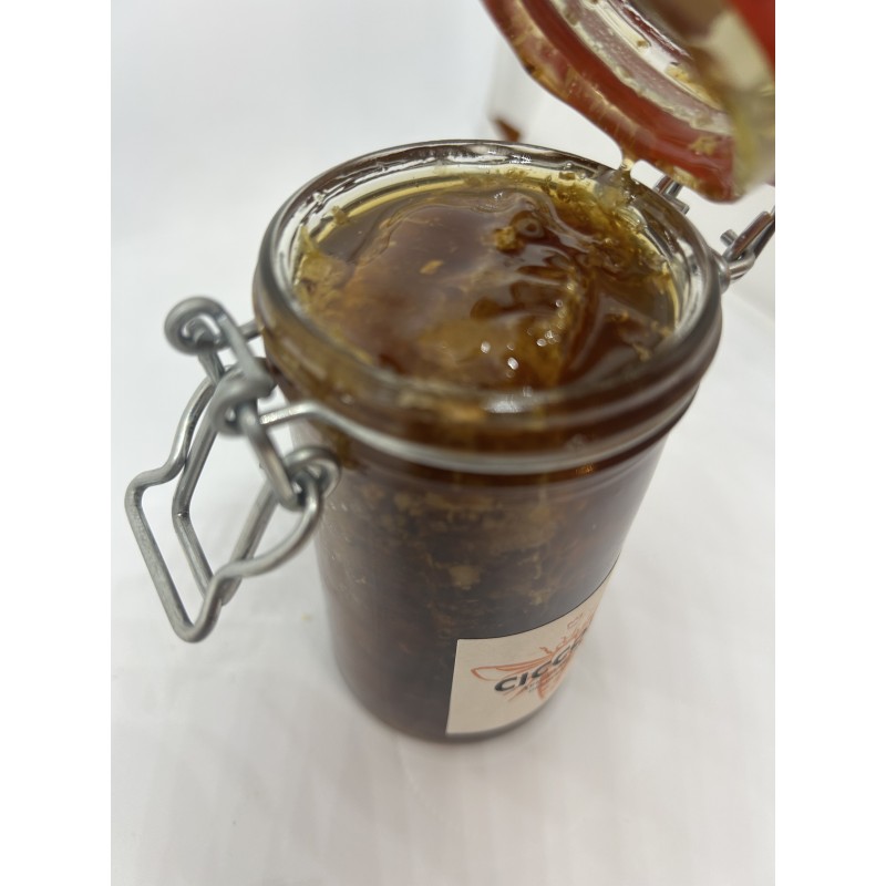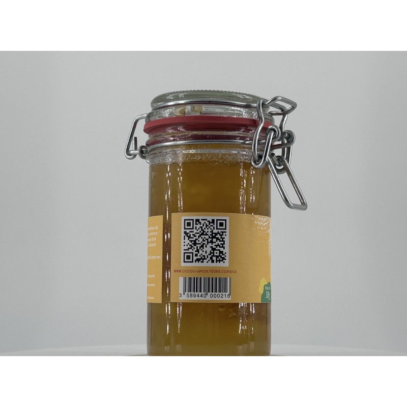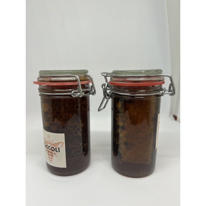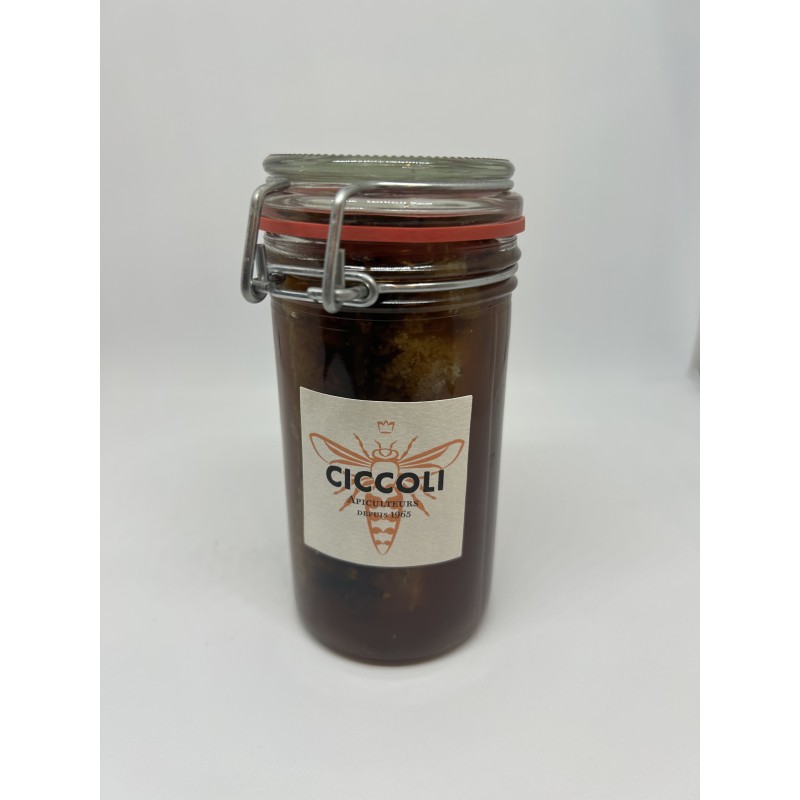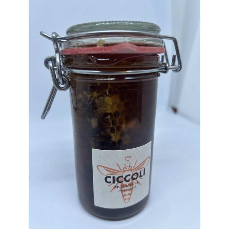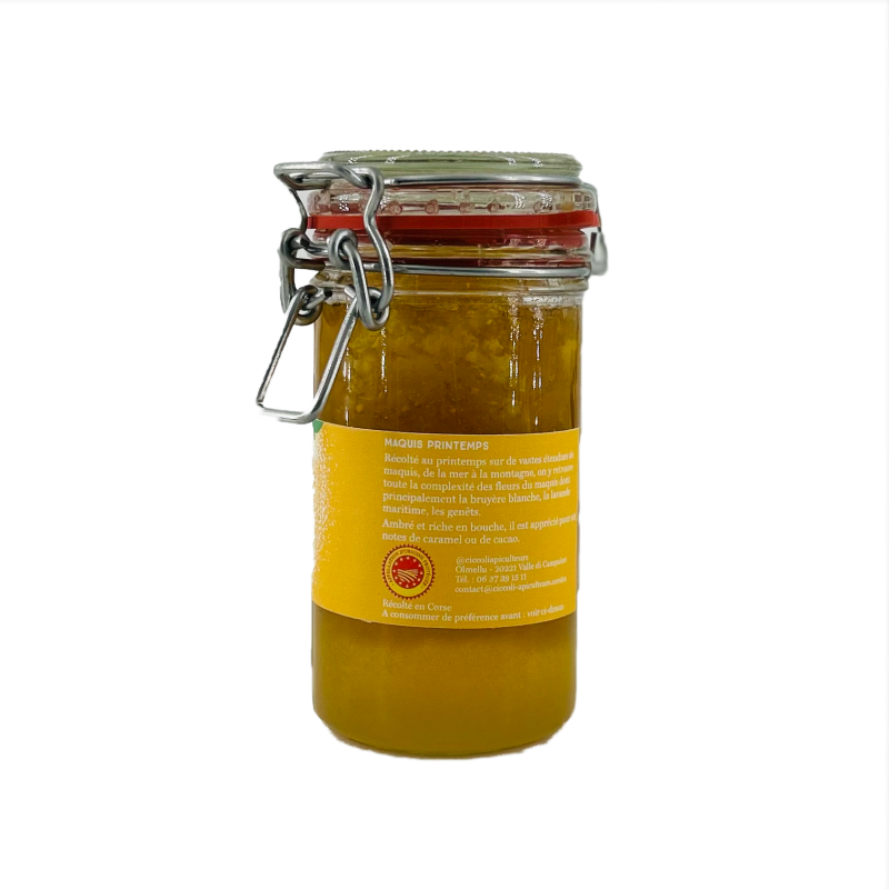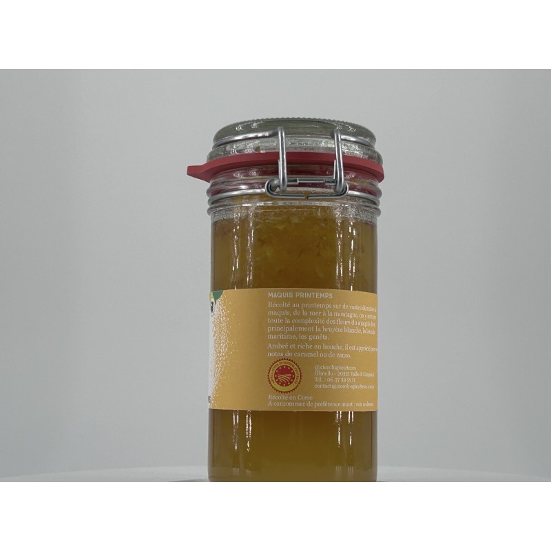 Miel de maquis de printemps très doux. Environ 150 gr en rayon. Le pot est complété par le même miel AOP.