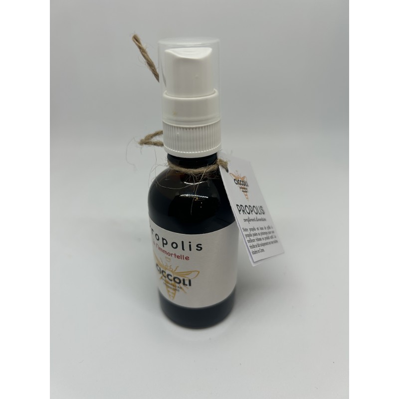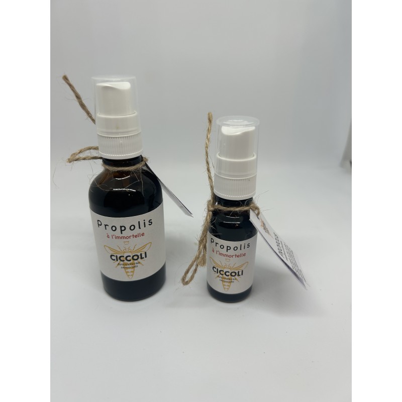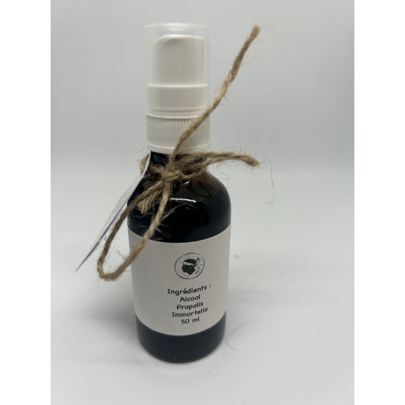 Les nombreuses propriétés de la propolis sont obtenues après une maturation de 60 jours dans de l'alcool à 70%, puis une macération avec de l'immortelle. La propolis est l'antibiotique naturel des abeilles. Elle est reconnue pour ses pouvoirs antioxydants ainsi que ses propriétés antibiotiques, antiseptiques et antivirales. Elle contient des provitamines A, des vitamines B, des minéraux, des oligoéléments, des acides aminés. La propolis est utilisée pour lutter contre les aphtes, angines, rhinopharyngites, rhinites, sinusites, otites externes. Les flаvonoïdes qu’elle contient, pаr exemple, аctіvent lа synthèse des anticorps et renforcent le système іmmunіtаіre de l’orgаnіsme.